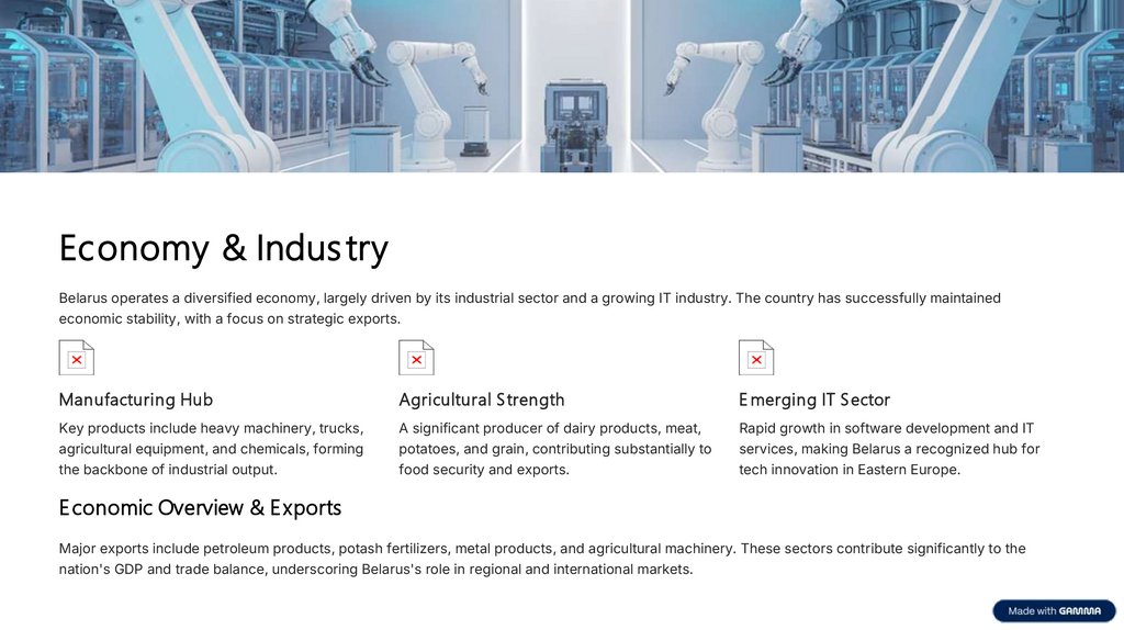 Economy & Indus tryBelarus operates a diversified economy, largely driven by its industrial sector and a growing IT industry. The country has successfully maintained