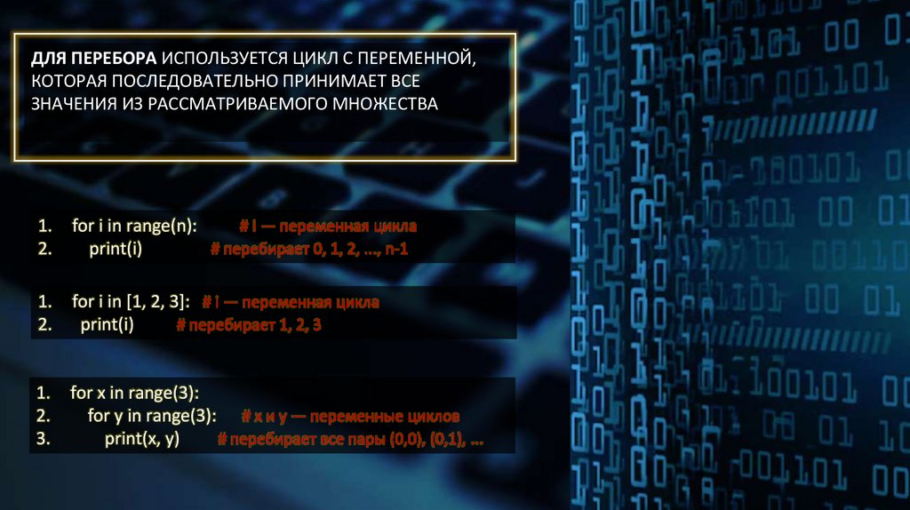 ДЛЯ ПЕРЕБОРА ИСПОЛЬЗУЕТСЯ ЦИКЛ С ПЕРЕМЕННОЙ,КОТОРАЯ ПОСЛЕДОВАТЕЛЬНО ПРИНИМАЕТ ВСЕ