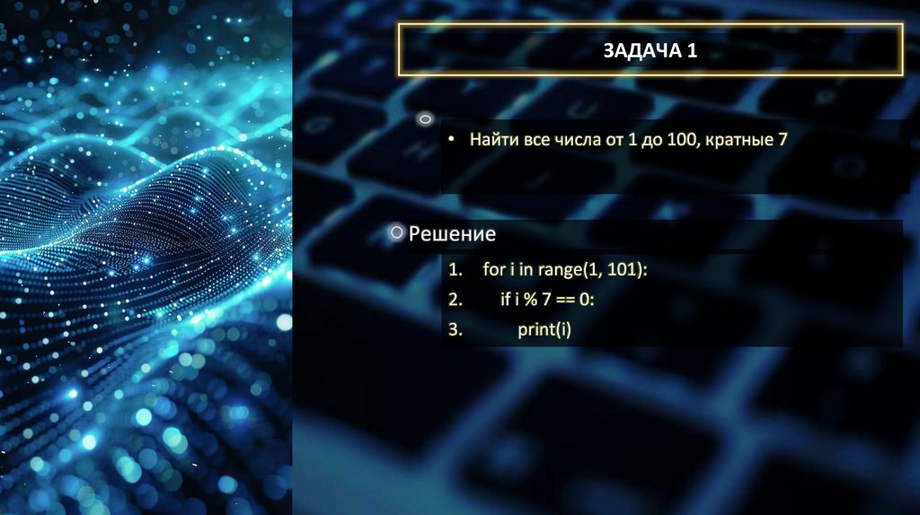 ЗАДАЧА 1• Найти все числа от 1 до 100, кратные 7