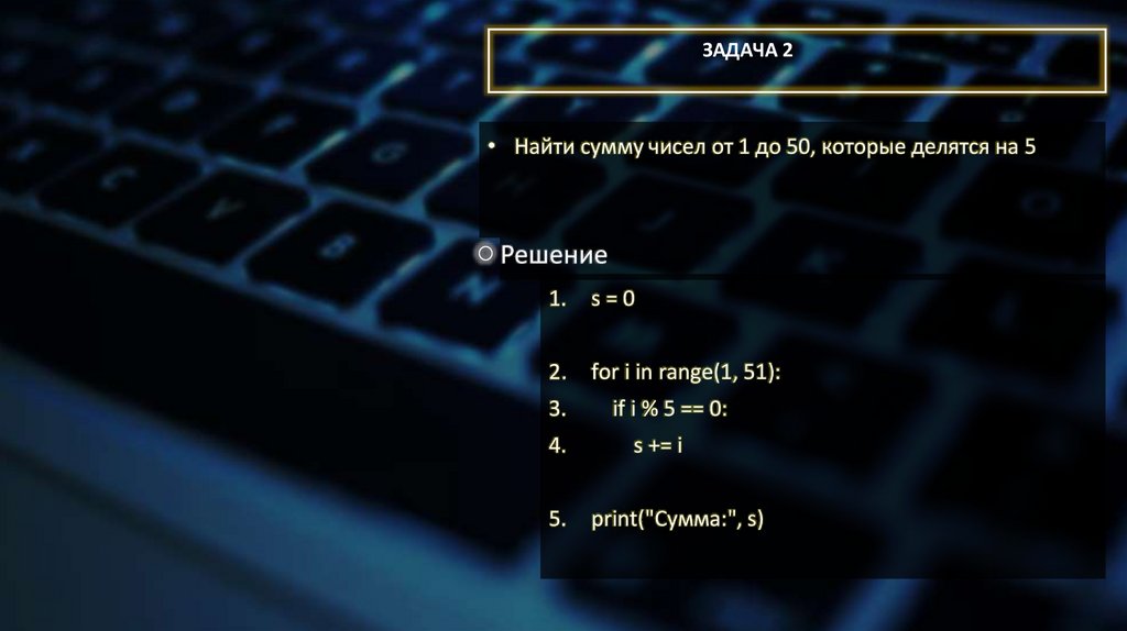ЗАДАЧА 2• Найти сумму чисел от 1 до 50, которые делятся на 5