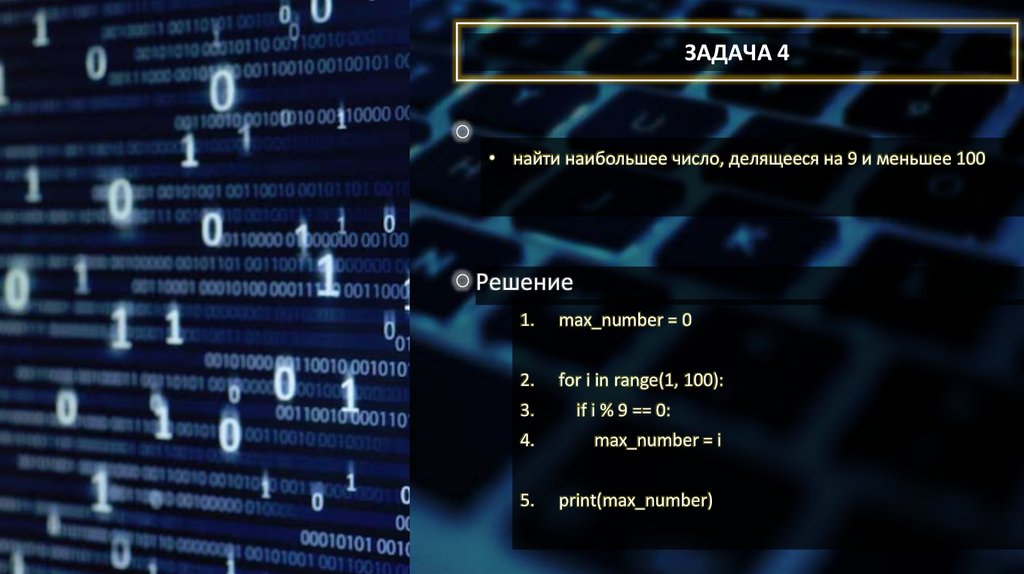ЗАДАЧА 4• найти наибольшее число, делящееся на 9 и меньшее 100