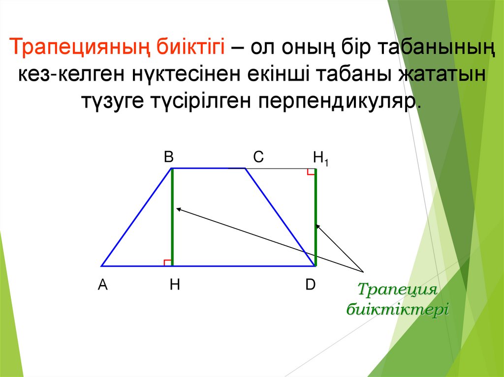 Трапецияның биіктігі – ол оның бір табаныныңкез-келген нүктесінен екінші табаны жататын