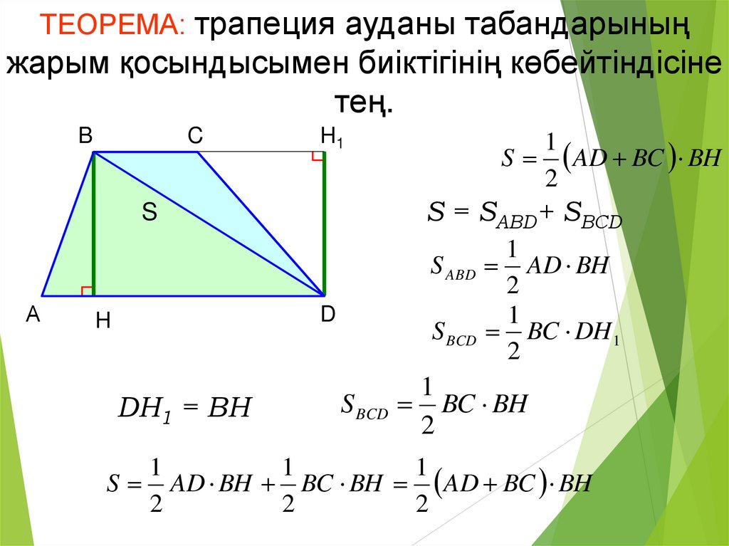 ТЕОРЕМА: трапеция ауданы табандарыныңжарым қосындысымен биіктігінің көбейтіндісіне