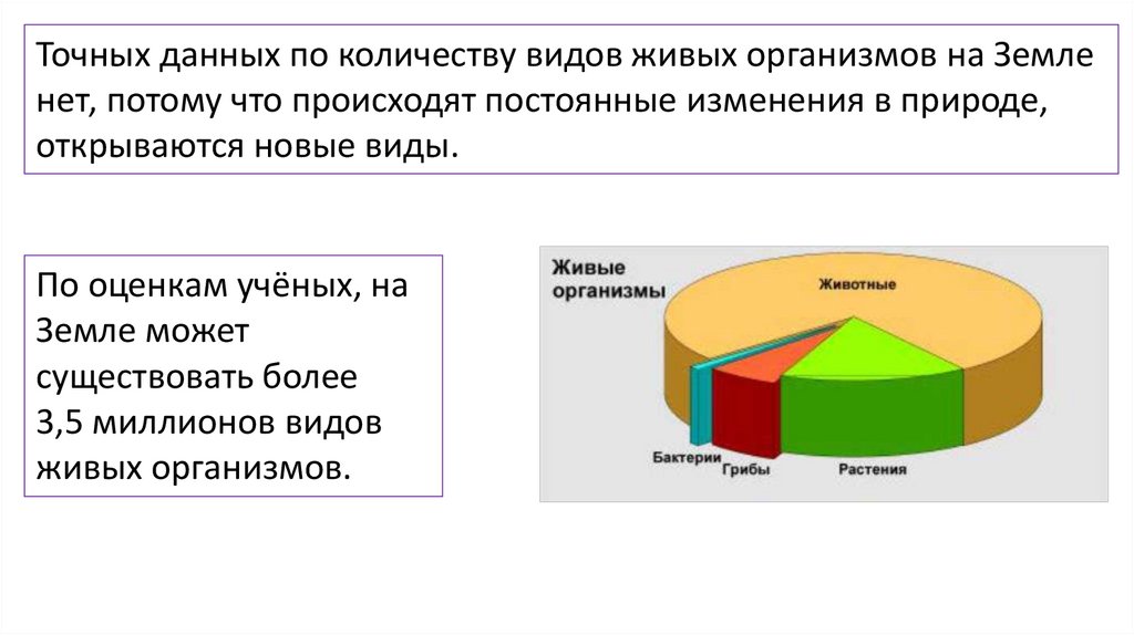Точных данных по количеству видов живых организмов на Земленет, потому что происходят постоянные изменения в природе,