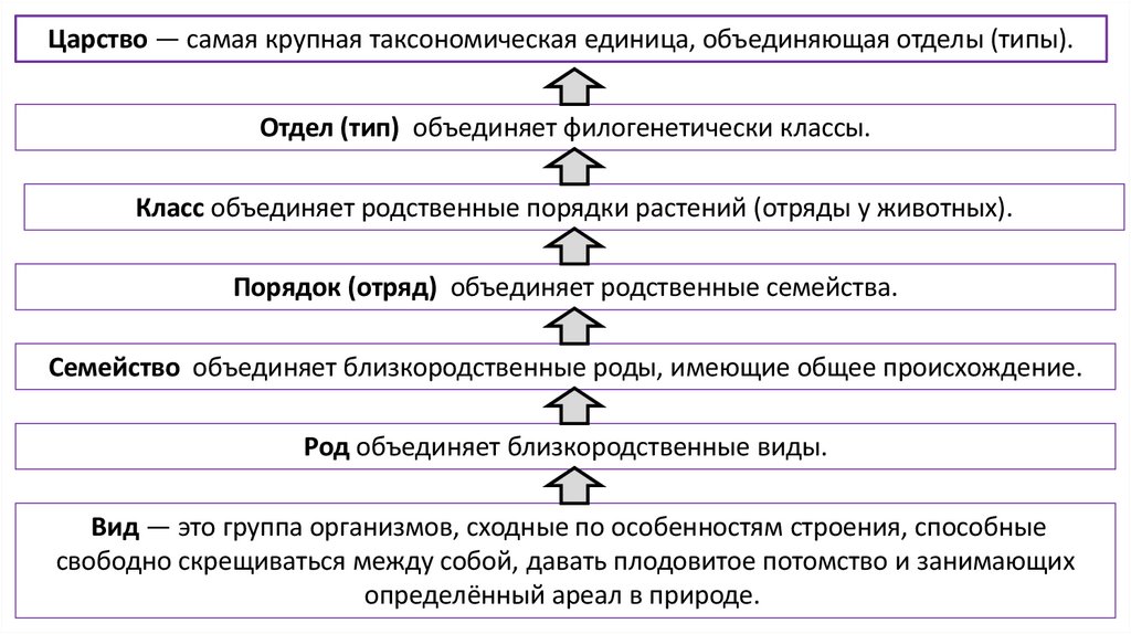 Царство — самая крупная таксономическая единица, объединяющая отделы (типы).Отдел (тип) объединяет филогенетически классы.