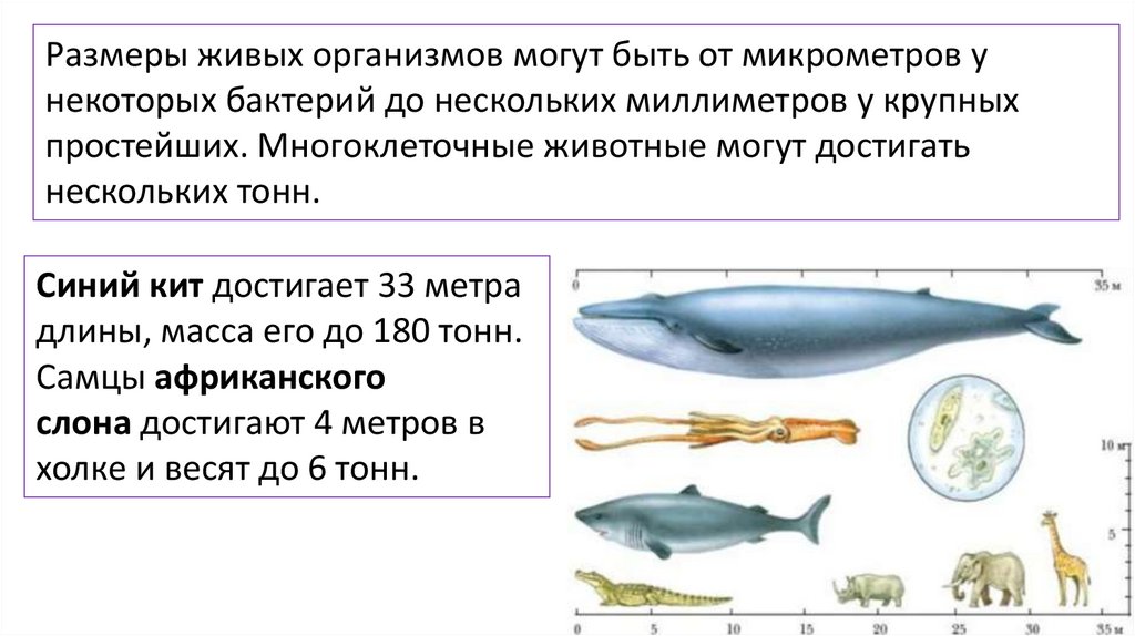 Размеры живых организмов могут быть от микрометров унекоторых бактерий до нескольких миллиметров у крупных