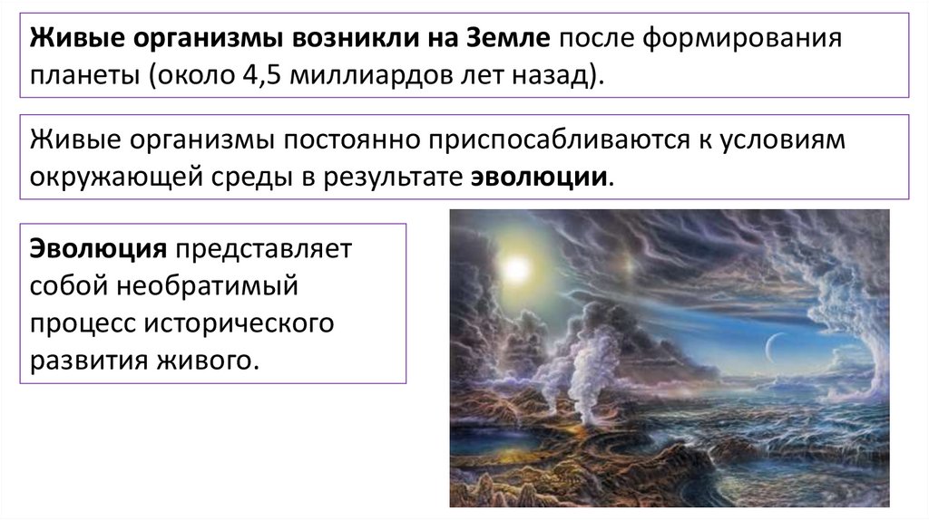 Живые организмы возникли на Земле после формированияпланеты (около 4,5 миллиардов лет назад).