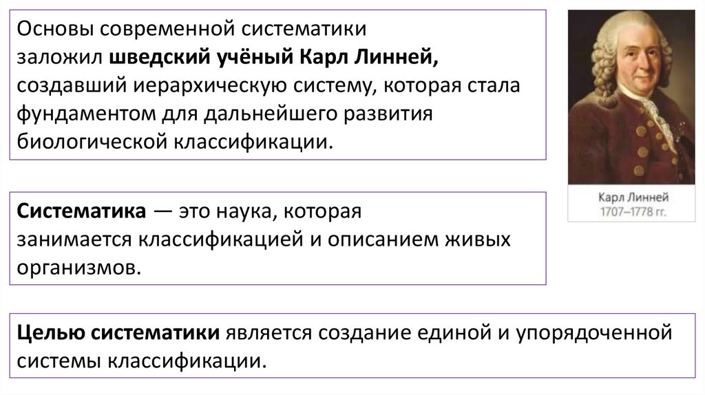 Основы современной систематикизаложил шведский учёный Карл Линней,