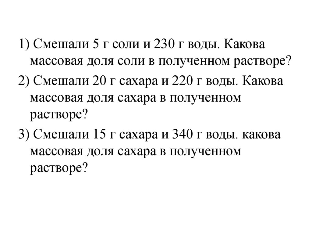 1) Смешали 5 г соли и 230 г воды. Каковамассовая доля соли в полученном растворе?