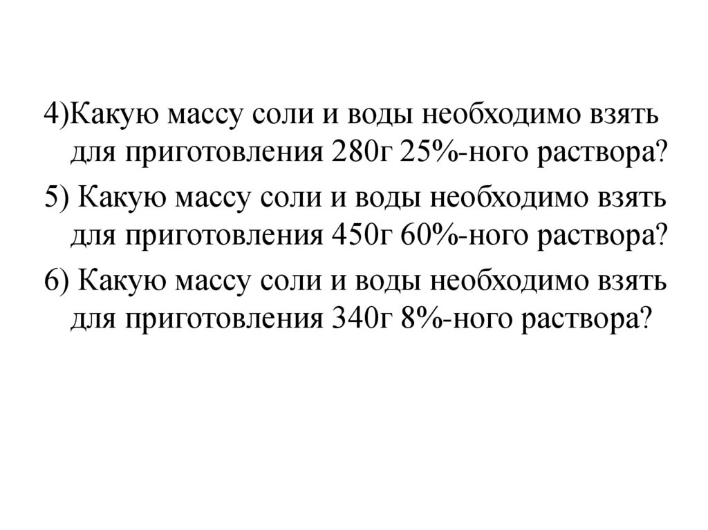 4)Какую массу соли и воды необходимо взятьдля приготовления 280г 25%-ного раствора?