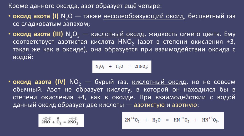 данный оксид образует две кислоты — азотистую и азотную: