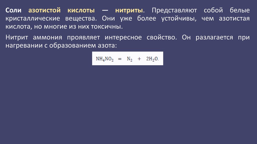 Соли азотистой кислоты — нитриты. Представляют собой белыекристаллические вещества. Они уже более устойчивы, чем азотистая