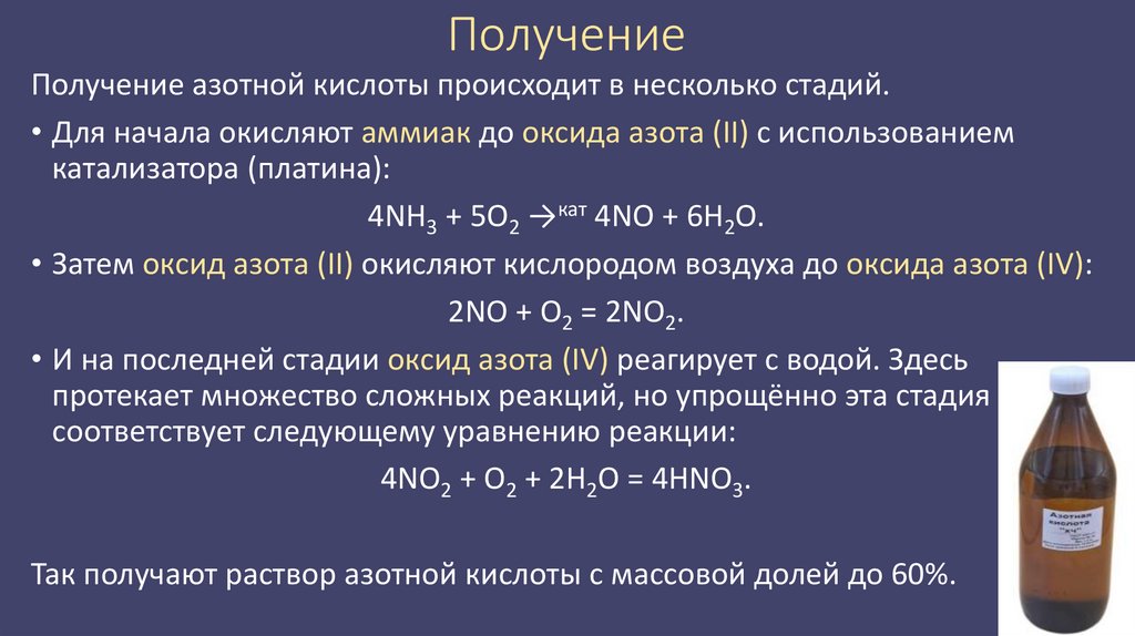 ПолучениеПолучение азотной кислоты происходит в несколько стадий.