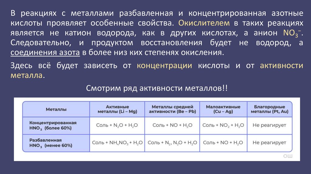 В реакциях с металлами разбавленная и концентрированная азотныекислоты проявляет особенные свойства. Окислителем в таких реакциях