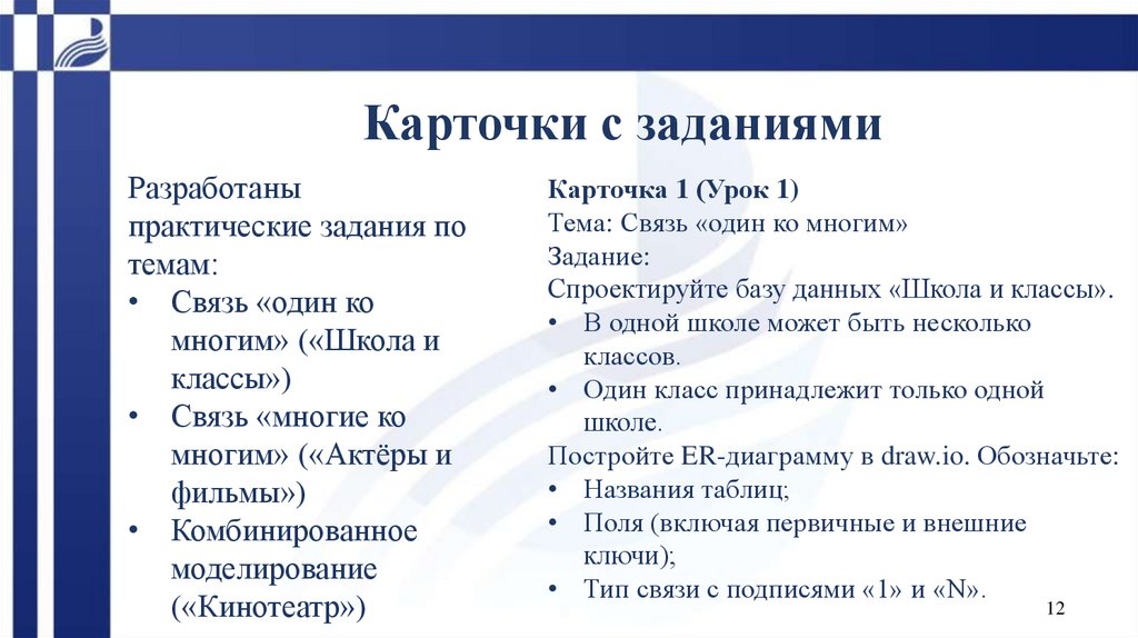 • Карточки с заданиями и эталонные ER – диаграммы