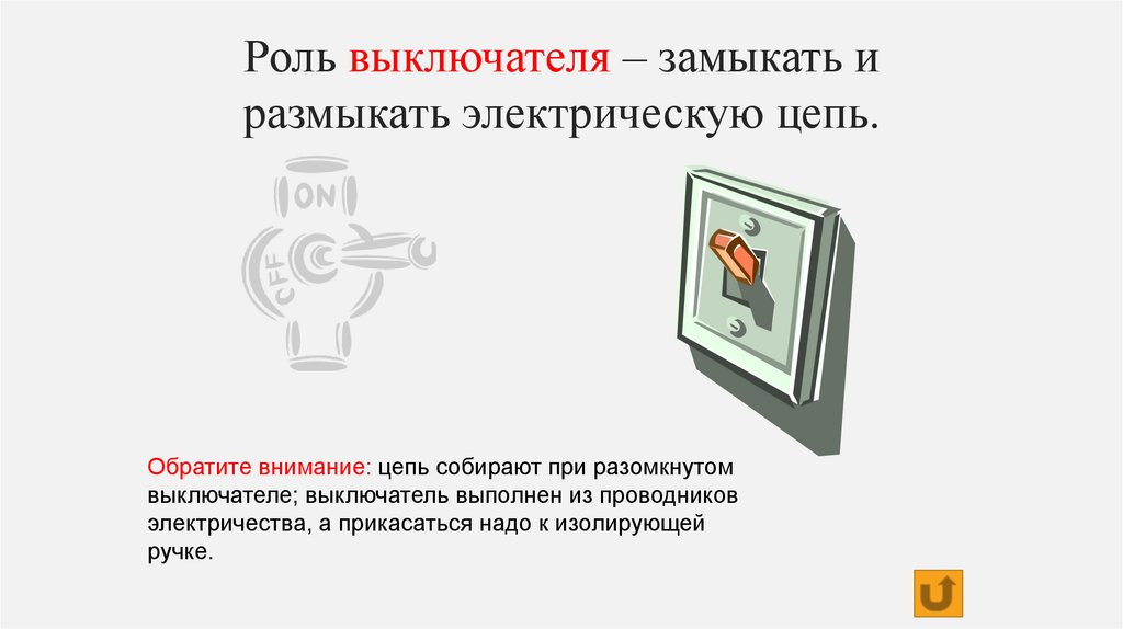 Роль выключателя – замыкать иразмыкать электрическую цепь.