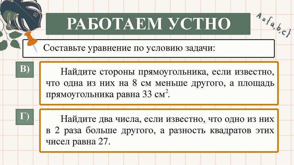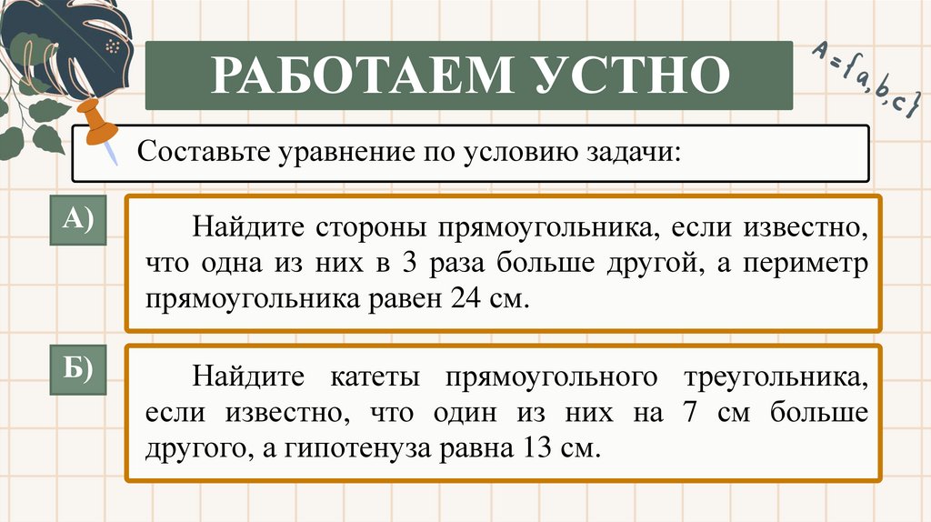 РАБОТАЕМ УСТНОСоставьте уравнение по условию задачи: