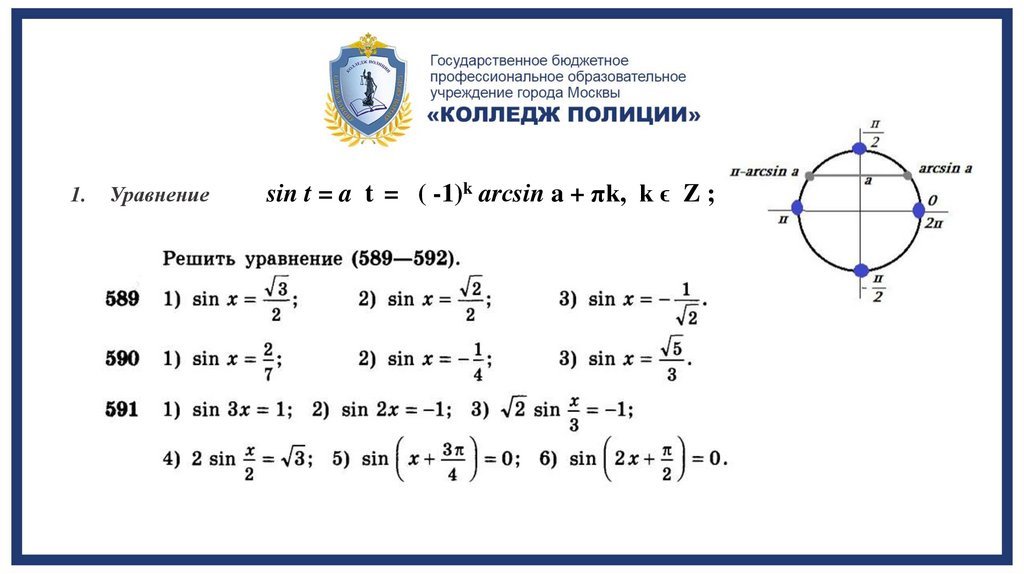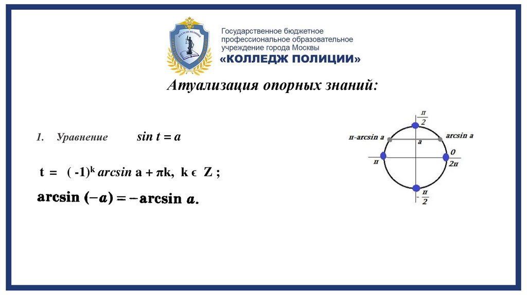 sin t = a t = ( -1)k arсsin a + πk, k ϵ Z ;