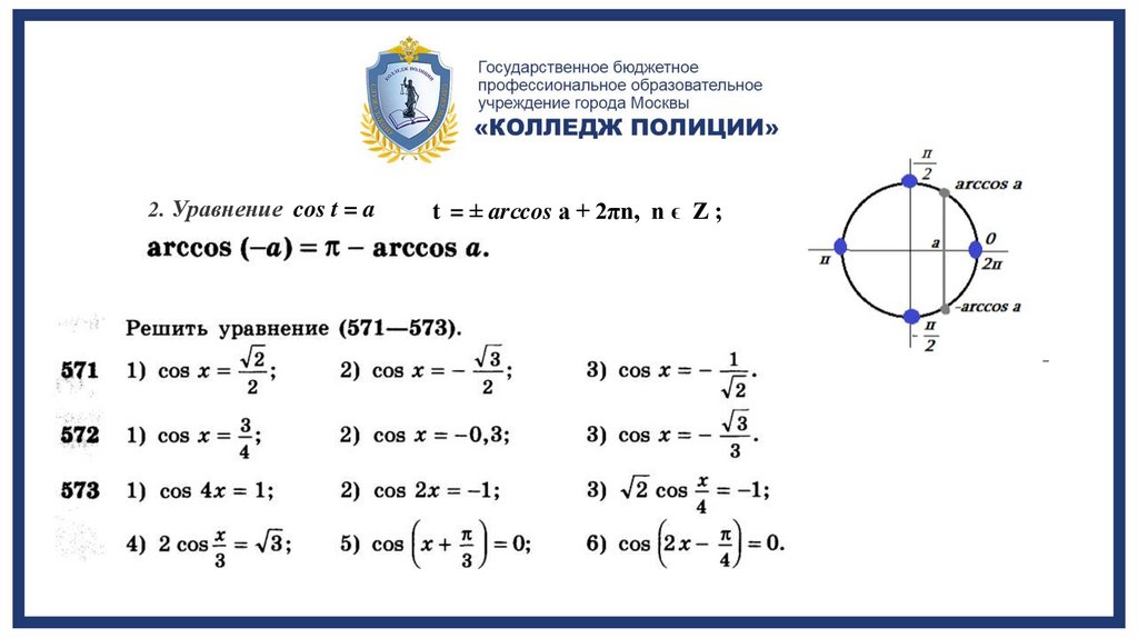2. Уравнение cos t = at = ± arсcos a + 2πn, n ϵ Z ;