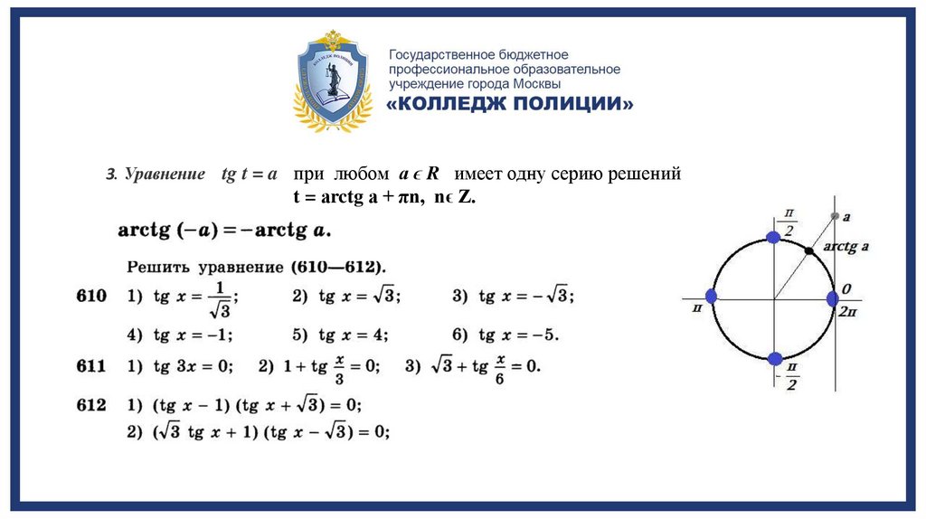 3. Уравнениеtg t = a при любом а ϵ R имеет одну серию решений
