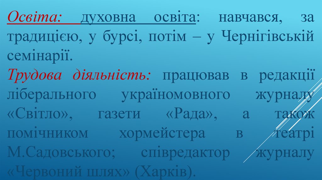 Освіта: духовна освіта: навчався, затрадицією, у бурсі, потім – у Чернігівській