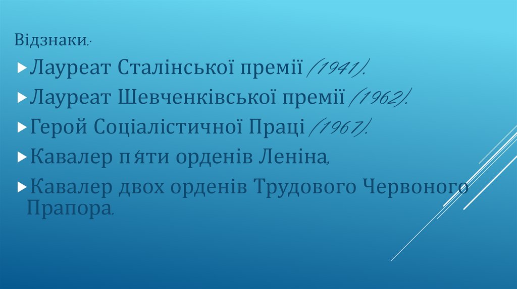 Лауреат Сталінської премії (1941). Лауреат Шевченківської премії