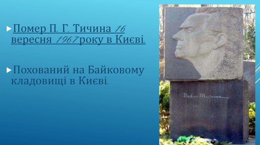 Помер П. Г. Тичина 16вересня 1967 року в Києві.