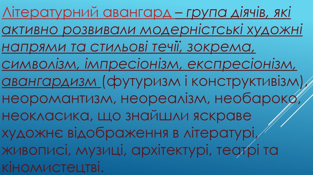 Літературний авангард – група діячів, якіактивно розвивали модерністські художні