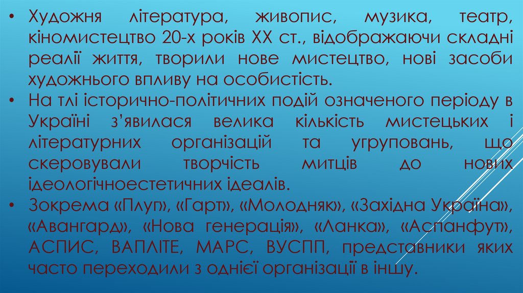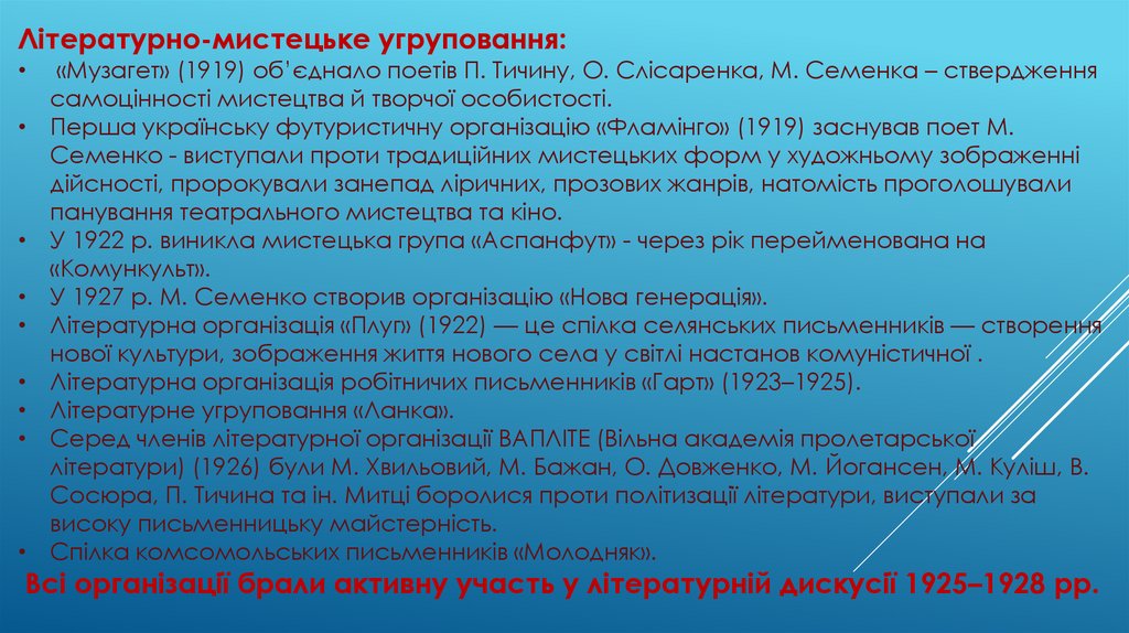 • Зокрема «Плуг», «Гарт», «Молодняк», «Західна Україна»,