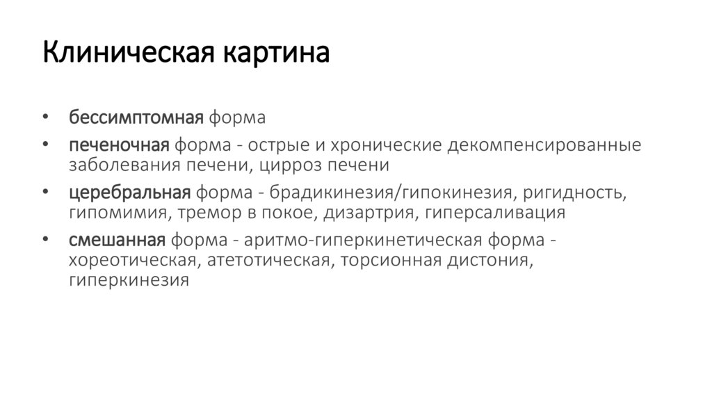 • церебральная форма - брадикинезия/гипокинезия, ригидность,