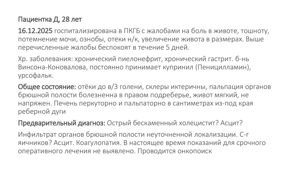 Пациентка Д, 28 лет16.12.2025 госпитализирована в ПКГБ с жалобами на боль в животе, тошноту,