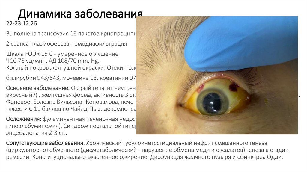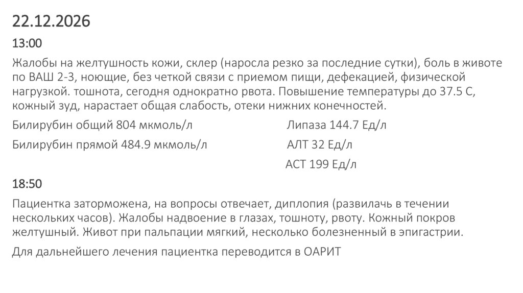 Жалобы на желтушность кожи, склер (наросла резко за последние сутки), боль в животе