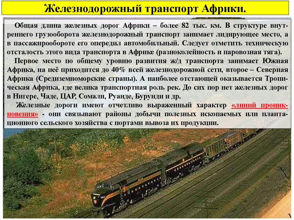 отсталость этого вида транспорта в Африке (разноколейность и паровозная тяга).