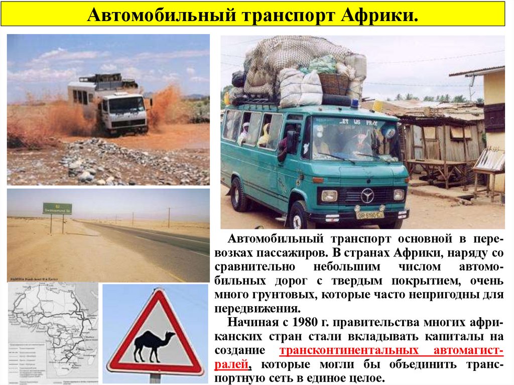 Автомобильный транспорт Африки.Автомобильный транспорт основной в перевозках пассажиров. В странах Африки, наряду со