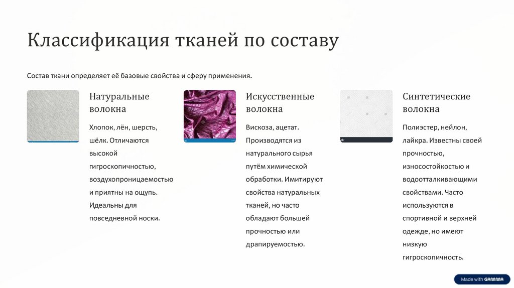 Классификация тканей по составуСостав ткани определяет её базовые свойства и сферу применения.