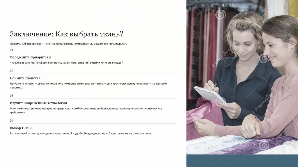 Заключение: Как выбрать ткань?Правильный выбор ткани — это инвестиция в ваш комфорт, стиль и долговечность изделий.