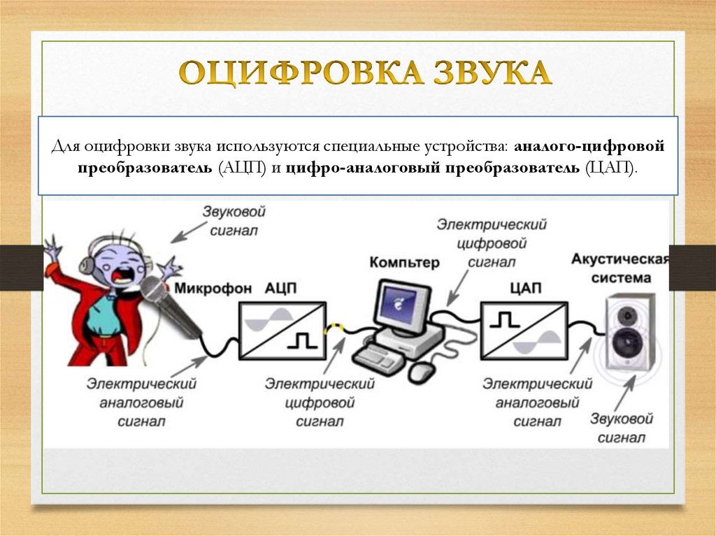 Для оцифровки звука используются специальные устройства: аналого-цифровойпреобразователь (АЦП) и цифро-аналоговый преобразователь (ЦАП).