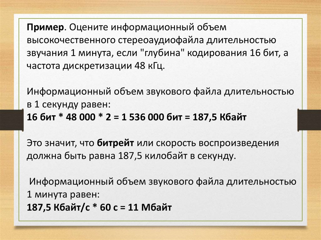 Пример. Оцените информационный объемвысокочественного стереоаудиофайла длительностью