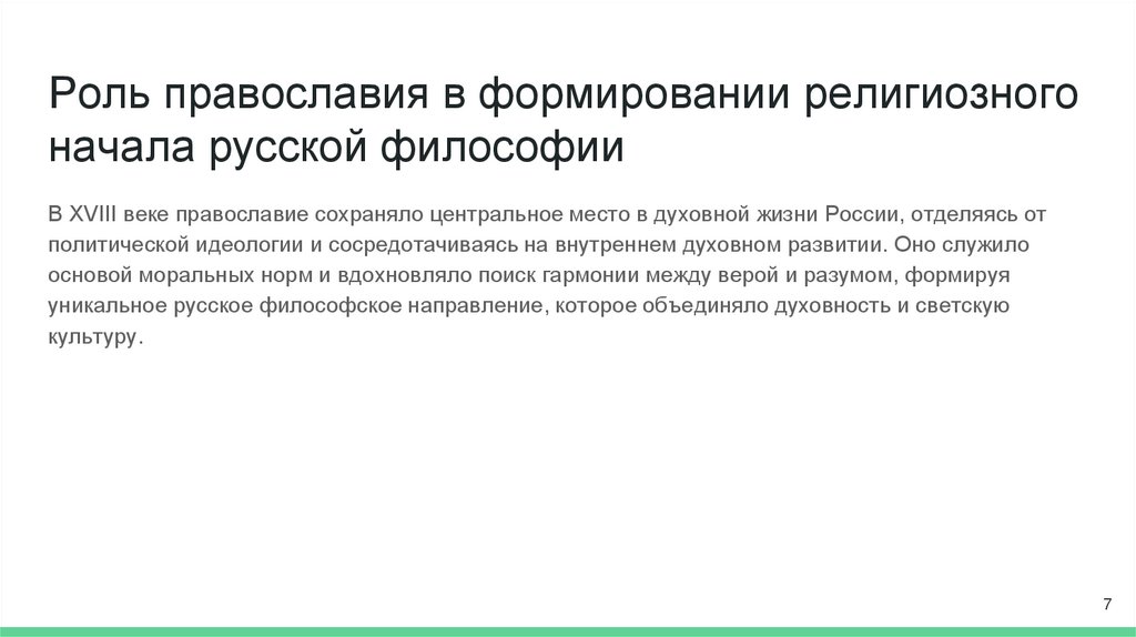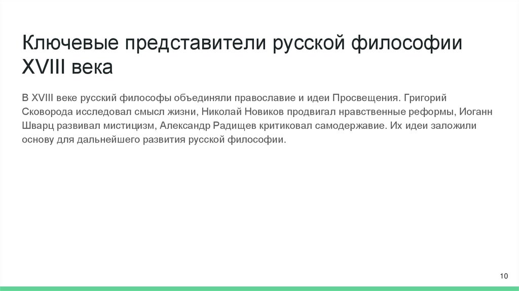 ЗаключениеРусская философия XVIII века формировалась на стыке традиционной православной духовности и