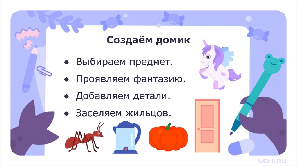 Изображать различные предметы в качестве домиков.