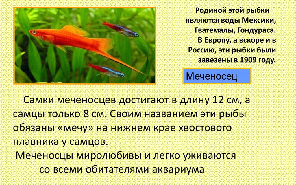 Самки меченосцев достигают в длину 12 см, а