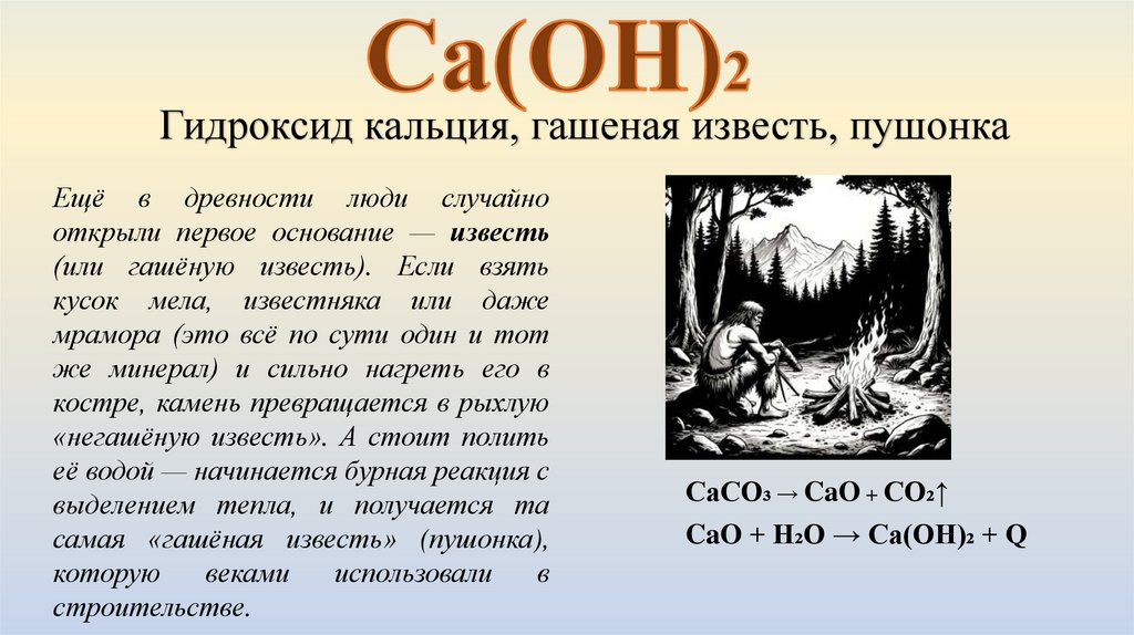 Гидроксид кальция, гашеная известь, пушонкаЕщё в древности люди случайно