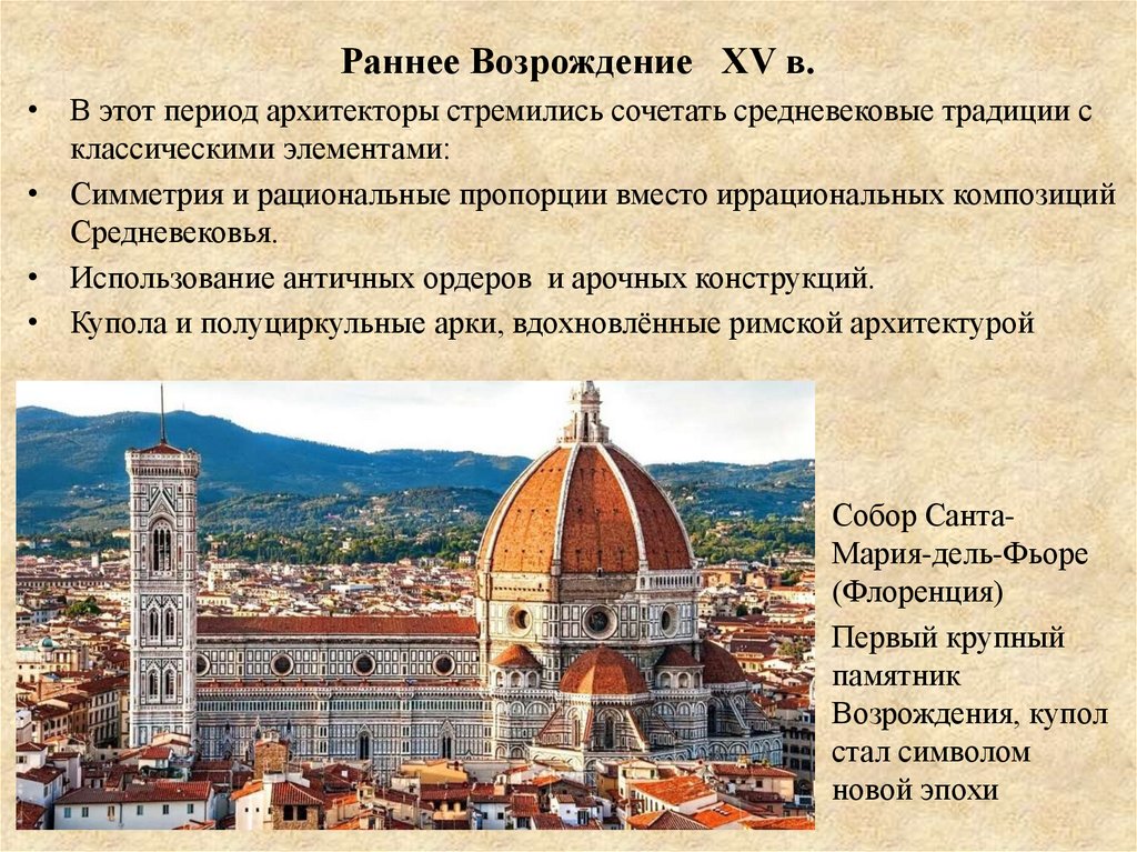 Раннее Возрождение XV в.• В этот период архитекторы стремились сочетать средневековые традиции с