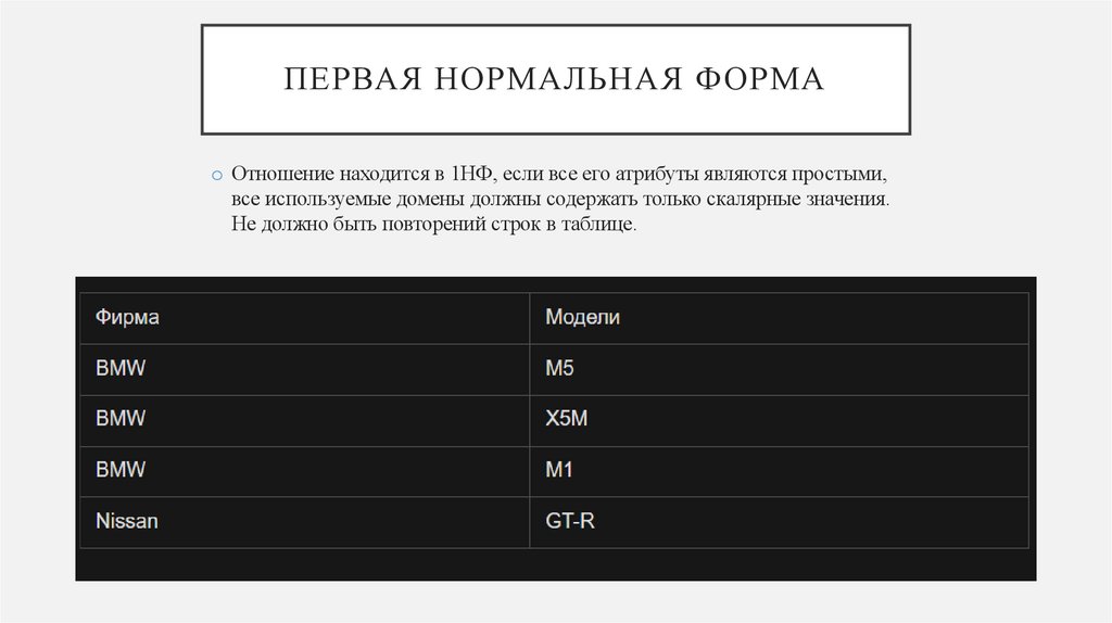 ПЕРВАЯ НОРМАЛЬНАЯ ФОРМАo Отношение находится в 1НФ, если все его атрибуты являются простыми,
