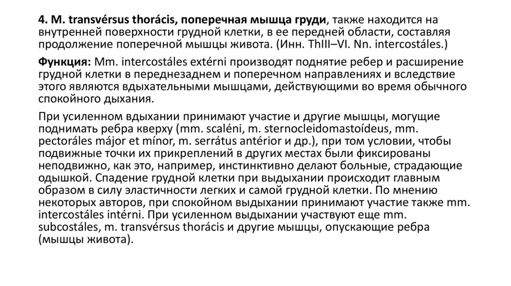 4. М. transvérsus thorácis, поперечная мышца груди, также находится навнутренней поверхности грудной клетки, в ее передней области, составляя