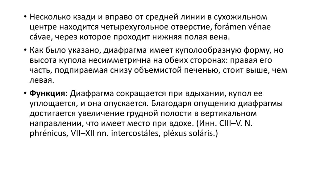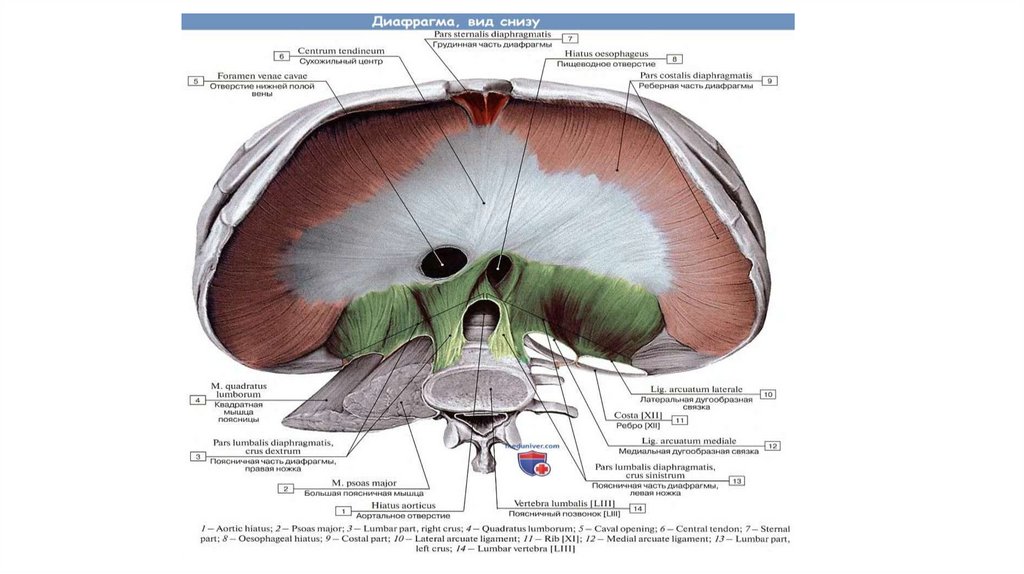 • Диафрагма, diaphrágma-представляет плоскую тонкую мышцу, m. phrénicus,