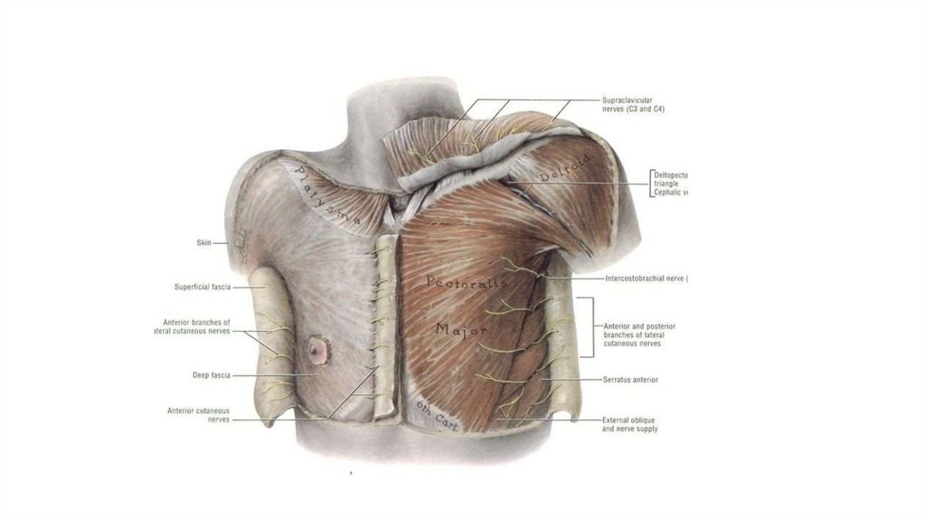 • Мышцы груди разделяются на мышцы, начинающиеся наповерхности грудной клетки и идущие от нее к поясу верхней