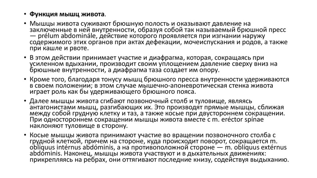 • Функция мышц живота.• Мышцы живота суживают брюшную полость и оказывают давление на