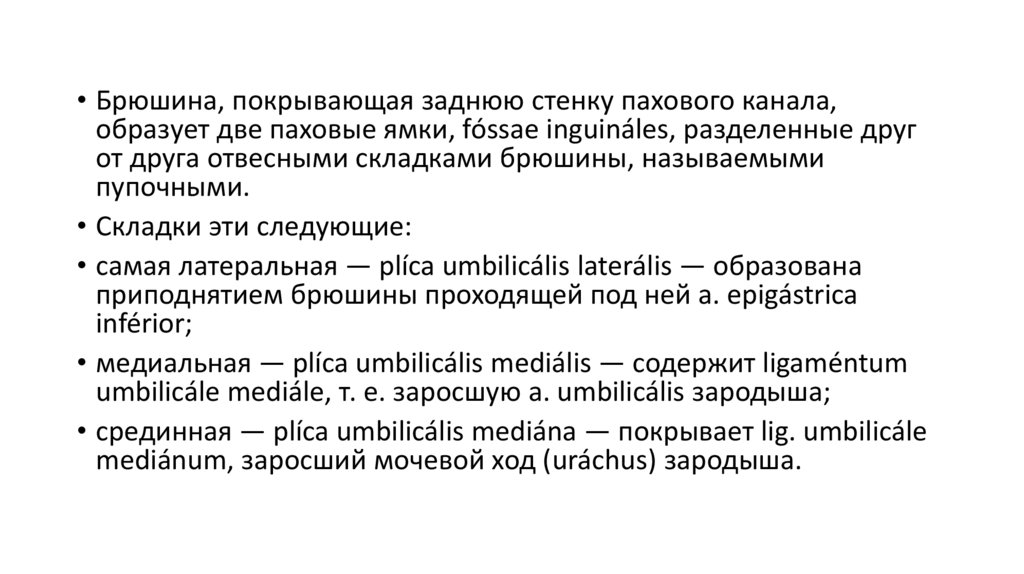 • Брюшина, покрывающая заднюю стенку пахового канала,образует две паховые ямки, fóssae inguináles, разделенные друг