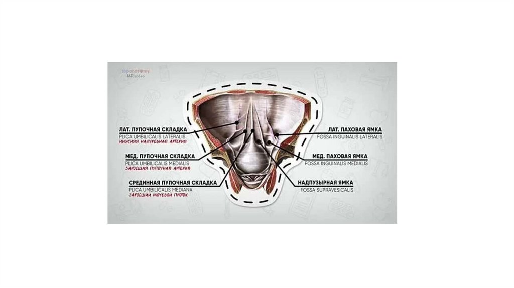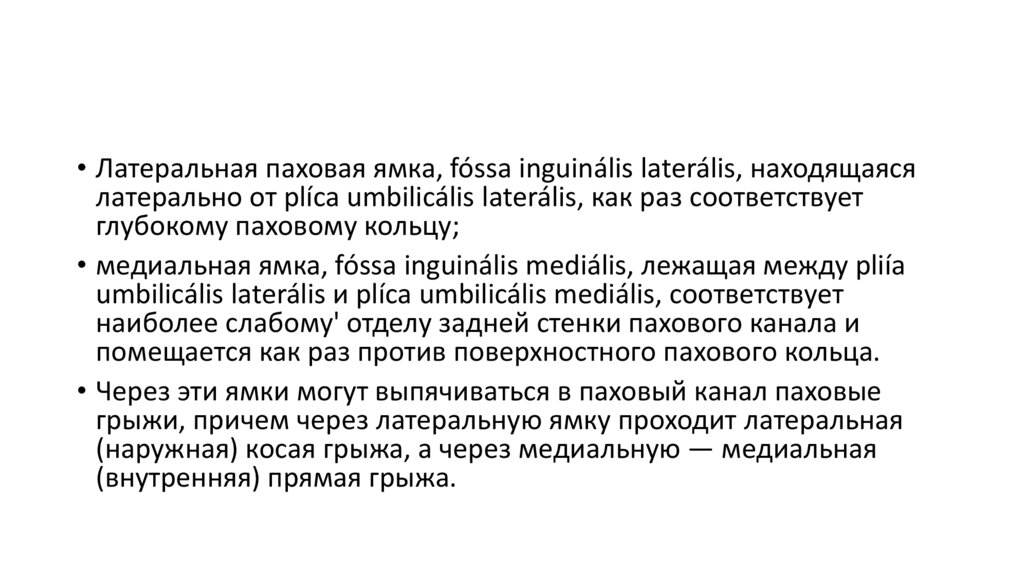 • Латеральная паховая ямка, fóssa inguinális laterális, находящаясялатерально от plíca umbilicális laterális, как раз соответствует